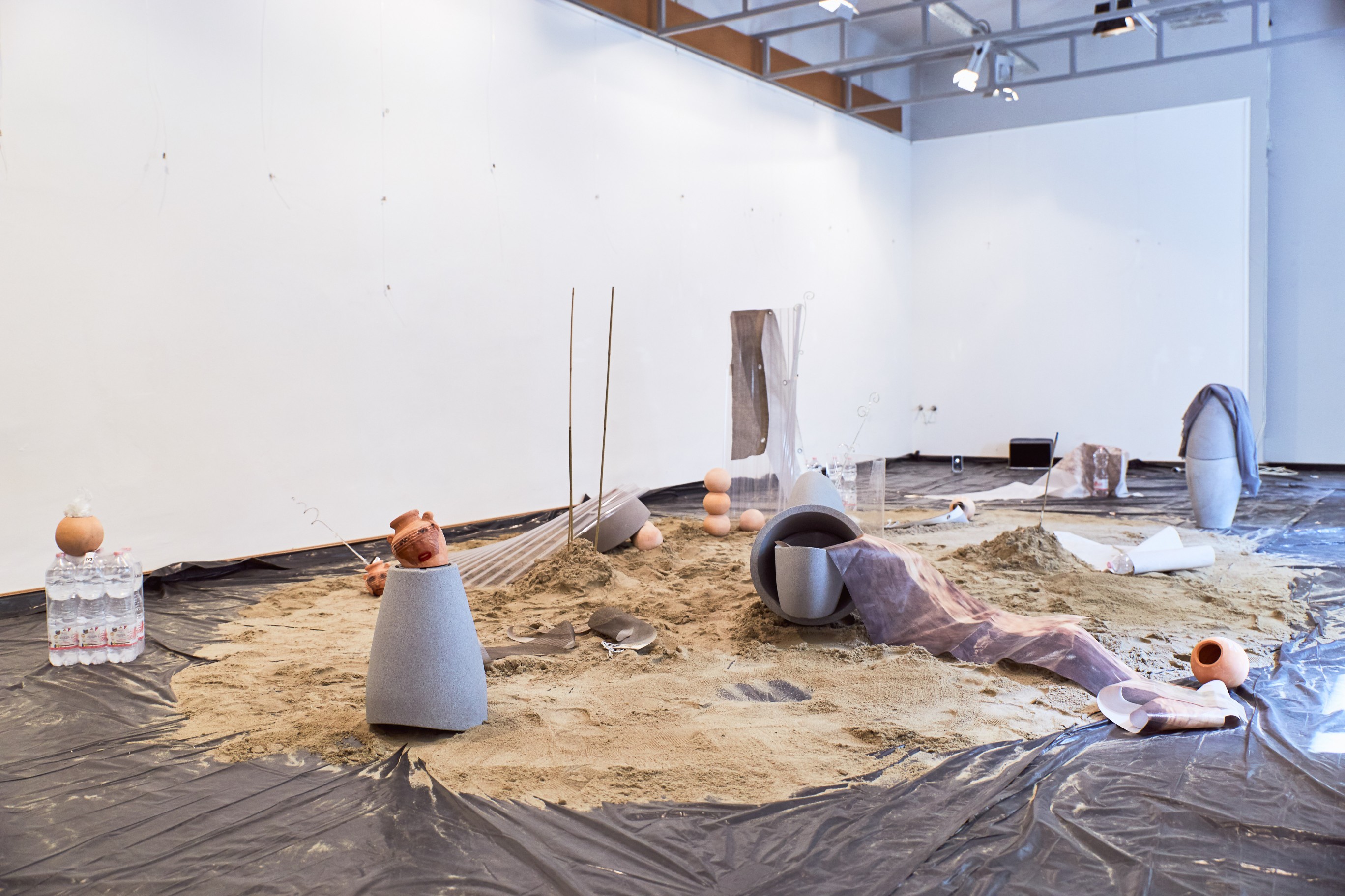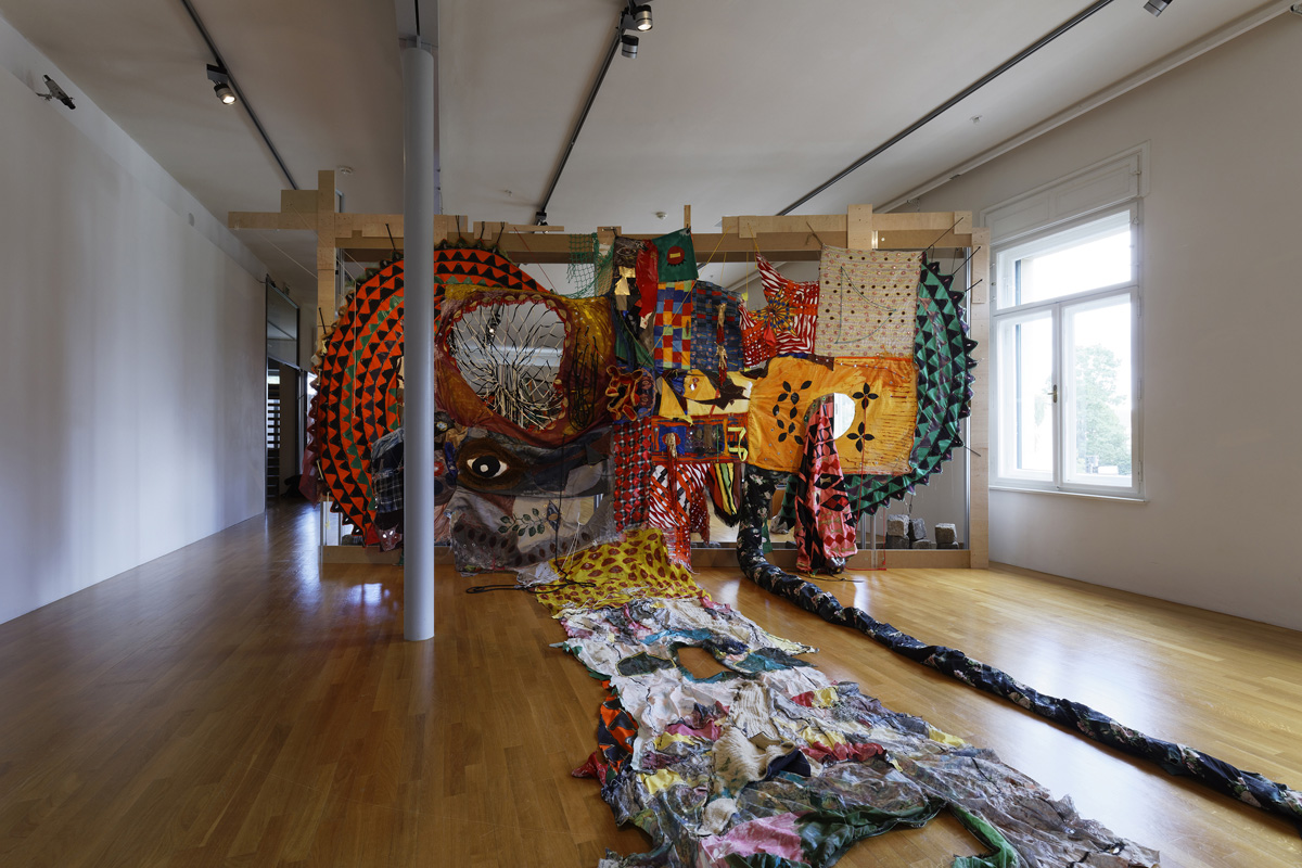 The colorful fabrics in Gili Avissar's works are sewn into extensive installations. They hang from scaffolding and divide the space like walls. Other shapes emerge from the objects, they are filled, connected or weighted down with ropes and strings in the room. The patterns and textures of the different fabrics come together in the installations to form shimmering collages.